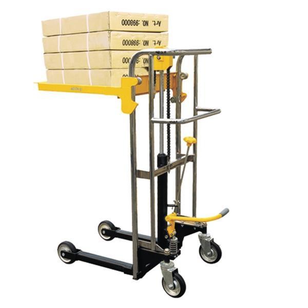 The FP0415 Manual Platform Stacker is a practical lifting device that can also be used as a working platform. The platform runs on lifting the carriage up and down on a chrome plate tubular frame, with easy operation lifting with folding pedal and lowering with a manual valve.